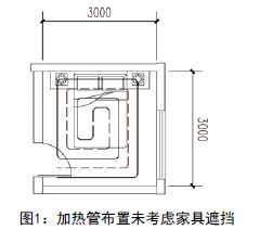 2013年年底,去河北燕郊一朋友的家里做客。客廳的溫度適宜,而臥室的落地的帶儲(chǔ)物箱的床板向上掀開(kāi)著,剛開(kāi)始還以為朋友擔(dān)心新家具有氣味,在做通風(fēng)處理。后經(jīng)朋友解釋?zhuān)X(jué)時(shí),在床上燥熱難受,但臥室內(nèi)溫度不高,不在床上時(shí),又覺(jué)得有點(diǎn)冷。白天,就把床板掀開(kāi),不然,房間里太冷……究其原因,臥室的面積不大,一張床,占據(jù)了房間的一大半面積,而加熱管又集中布置在了床下的位置。以至造成用戶(hù)的不適。如圖1所示: