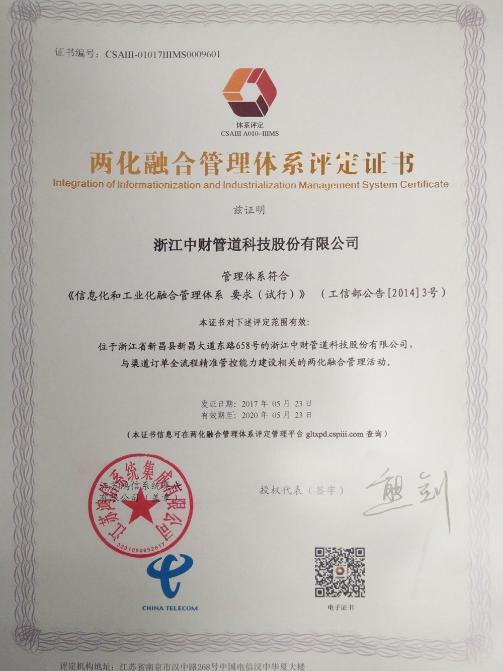 浙江中財管道通過國家兩化融合管理體系認定并獲政府獎金100萬